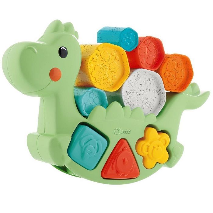 Giocattolo 2 in 1 a forma di dinosauro, fatto all'80% di plastica riciclabile. Con tre diverse attività di gioco, aiuta a sciluppare le abilità cognitive e manuale.
