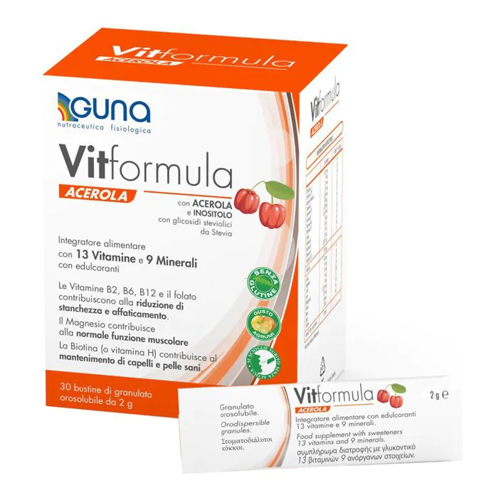 - Con succo di acerola, inositolo, 13 vitamine e 9 minerali.
