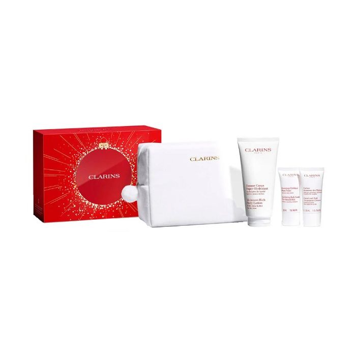 Clarins value set baume corps xmas 25 baume corps super hydratant 200 ml + exfoliating body scrub 30 ml new + hand&nail treatement cream 30 ml + large pouch