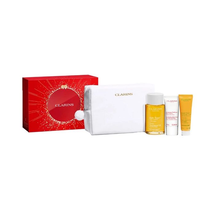 Clarins value set huile tonic xmas 25 huile tonic 100 ml + exfoliating body scrub 30 ml + tonic body balm 30 ml + large pouch