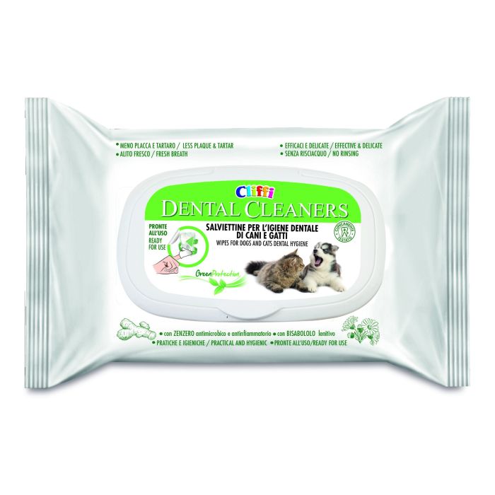 Avvolgere la salviettina DENTAL CLEANERS sull’indice e passarla sui denti e sulle gengive dell’animale.