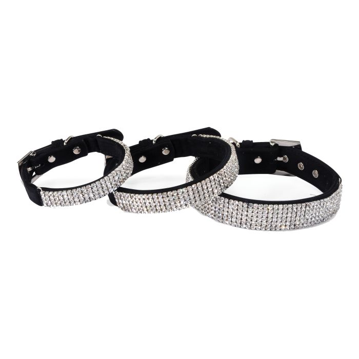 Elegantissimo collare in velluto nero con fascia di strass sia nel collare che nella fibbia. Abbinabile al guinzaglio in velluto con strass.