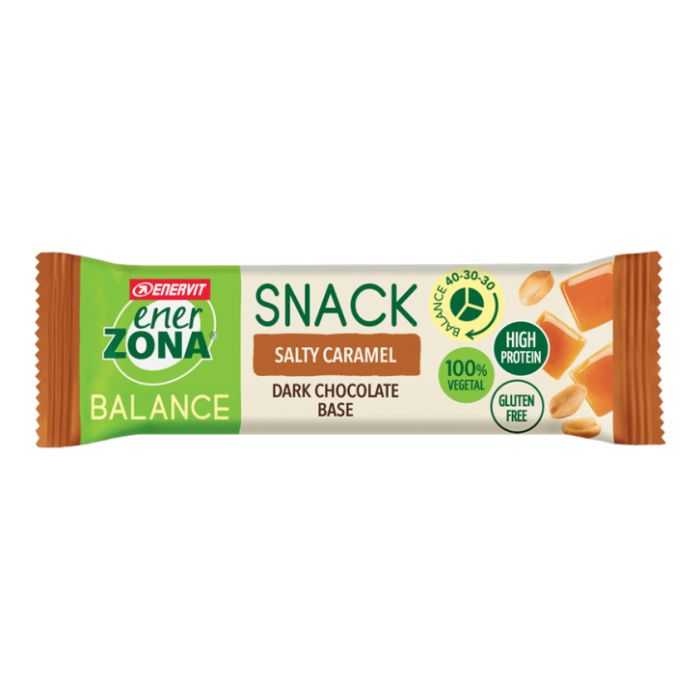 Barretta gusto Salty Caramel, con base di cioccolato fondente. Ricco in proteine, senza glutine, senza olio di palma, ricco in fibre.
