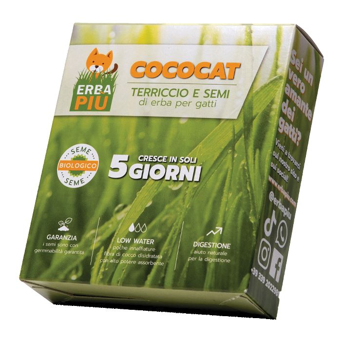 Pianta pronta di erba per gatti. Una vaschetta in plastica riciclabile contenente terriccio e semi di erba per gatti già germogliati e cresciuti, pronti per la somministrazione al gatto.