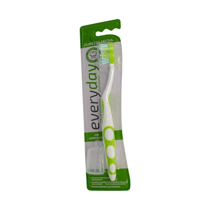 La testina e le setole dello Spazzolino Antiplacca everyday sono state studiate appositamente per favorire una pulizia profonda dei denti, anche negli spazi interdentali più difficili da raggiungere. Grazie agli elementi laterali in morbida gomma, consente un massaggio delicato sulle gengive, stimolandole e favorendo la circolazione sanguigna. Il manico ergonomico in materiale bicomponente permette un'impugnatura comoda e salda. Il pratico copritestina permette di portare con sé lo spazzolino ovunque salvaguardando l'igiene della testina.