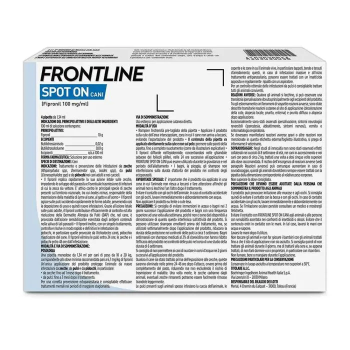 - Evitare il contatto con Frontline Spot On Cani agli animali o alle persone con sensibilità accertata nei confronti di insetticidi o alcool