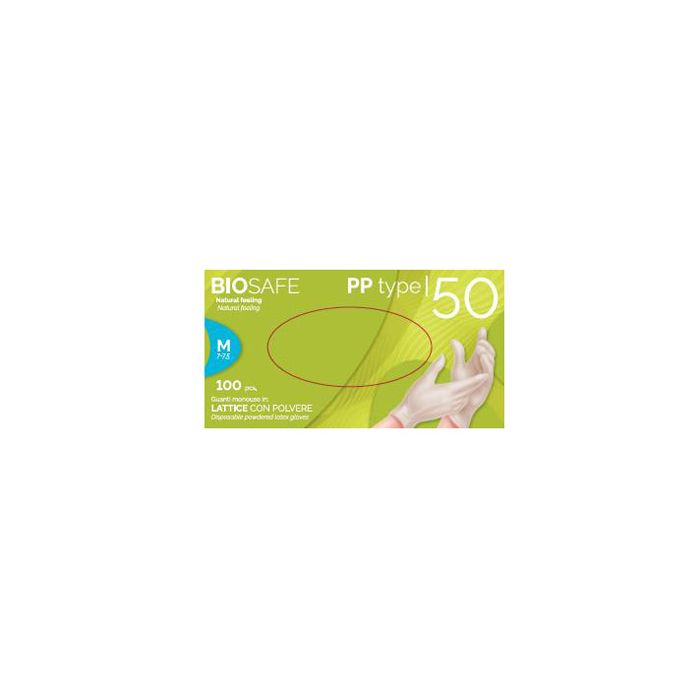 Guanti da esaminazione ed esplorazione in lattice naturale di prima qualità, monouso, non sterili, leggermente aspersi di polvere lubrificante, colore bianco, forma anatomica intercambiabile destra e sinistra (ambidestri) e superficie liscia. I polsini hanno un bordino elastico anti-arrotolamento che rinforza l'estremità del guanto, ne aumenta la vestibilità ed impedisce alla manichetta di arrotolarsi, e sono di lunghezza tale da consentirne l'aderenza al camice in qualunque posizione della mano. I guanti BIOSAFE PP TYPE 50 sono realizzati a corpo unico, quindi privi di saldature e di sbavature, hanno un'ottima consistenza, elasticità e morbidezza tali da garantire una perfetta aderenza ed un'ottima sensibilità all'operatore. Sono privi di impurezze ed uniformi nella distribuzione, esenti da macchie o imperfezioni di qualsivoglia natura. Grazie all'elevata biocompatibilità ed ergonomicità, permettono un uso prolungato senza affaticamento. Colore bianco. Non sterili.