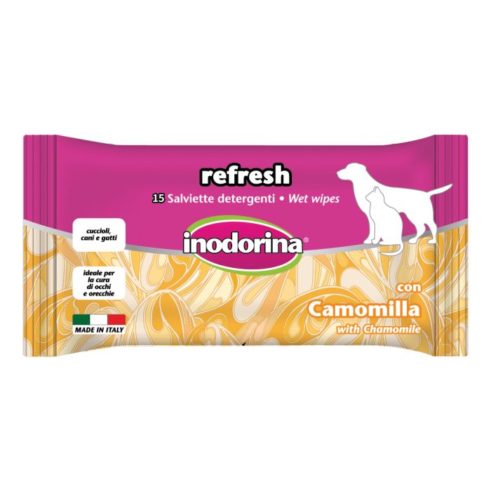 Morbide salviette detergenti particolarmente indicate per detergere con delicatezza gli occhi e le orecchie degli animali. La formula emolliente, rispettando il pH naturale, neutralizza le molecole di cattivo odore rilasciando una gradevole profumazione alla camomilla.