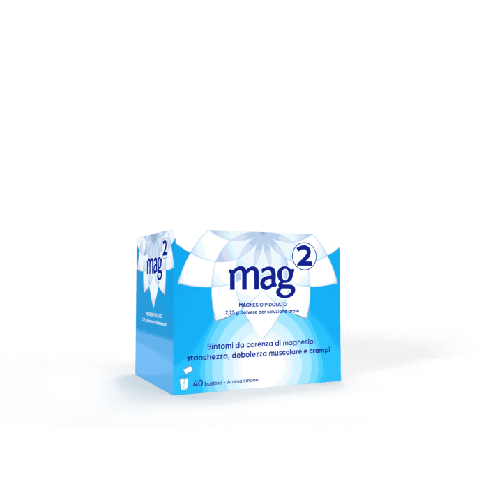 Mag2 Granulato Soluzione Orale è un integratore alimentare a base di magnesio pidolato, formulato per colmare le carenze di magnesio nell'organismo. Ogni confezione contiene 40 bustine da 2,25 g ciascuna, facili da assumere e rapidamente assimilabili. Il magnesio è un minerale essenziale per il corretto funzionamento del sistema nervoso, muscolare e osseo, oltre a contribuire alla riduzione della stanchezza e dell'affaticamento. Mag2 Granulato Soluzione Orale è particolarmente indicato in caso di aumentato fabbisogno di magnesio, stress, attività fisica intensa e periodi di convalescenza. La sua formulazione in granulato effervescente si dissolve rapidamente in acqua, offrendo una soluzione pratica e gradevole da assumere quotidianamente.