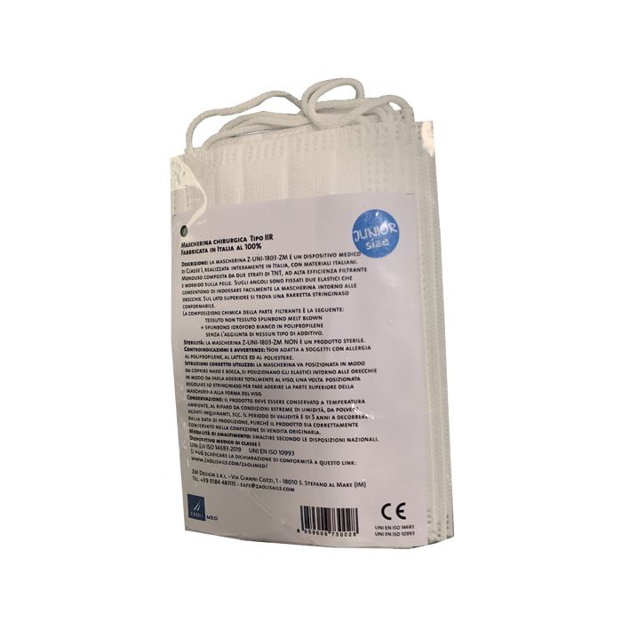 La mascherina Z-UNI-1803-ZM è un dispositivo medico di Classe I, realizzata interamente in Italia, con materiali italiani. Monouso composta da due strati di TNT, ad alta efficienza filtrante e morbido sulla pelle. Sugli angoli sono fissati due elastici che consentono di indossare facilmente la maschera intorno alle orecchie. Sul lato superiore si trova una barretta stringinaso conformabile.