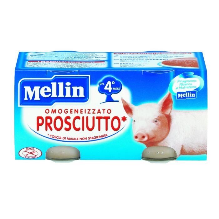 Omogeneizzato con carne di prosciutto (coscia di maiale non stagionata) senza saleaggiunto, indicato dal 4° al 36° mese salvo diverso parere del Pediatra.Alimento per l'infanzia che non contiene glutine.