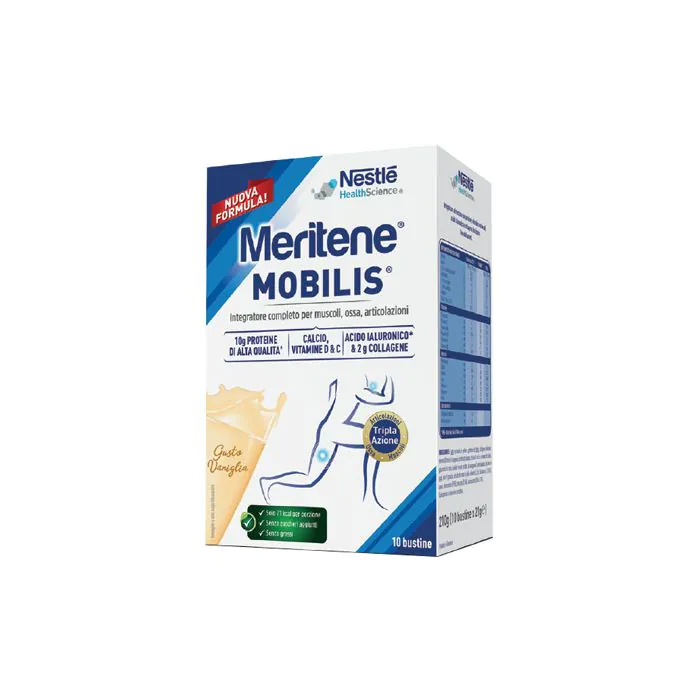 Meritene Mobilis Vaniglia è un integratore alimentare completo in polvere, studiato per sostenere il benessere di muscoli, ossa e articolazioni. Grazie alla sua formula avanzata con 22 nutrienti, tra cui proteine di alta qualità, calcio, vitamina D, vitamina C, collagene idrolizzato e acido ialuronico, svolge una tripla azione mirata. Supporta la massa muscolare, favorisce il mantenimento di ossa forti e contribuisce alla normale funzionalità delle articolazioni. È ideale per adulti attivi, persone in fase di recupero o con aumentato fabbisogno nutrizionale. Senza glutine e zuccheri aggiunti, nel pratico formato da 10 bustine gusto vaniglia.