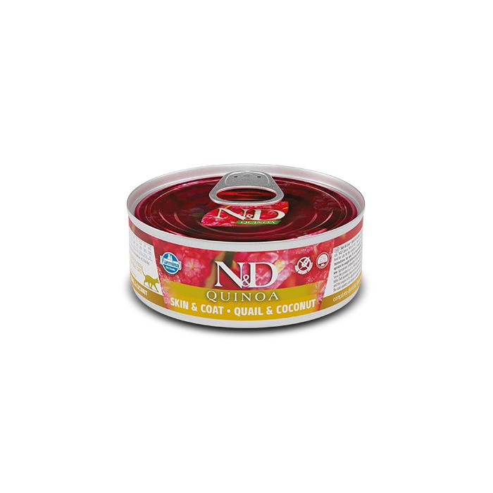 N&D Quinoa Skin & Coat - Quail & Coconut è un alimento dietetico completo per gatti, consigliato per la riduzione di intolleranze a ingredienti e sostanze nutritive.