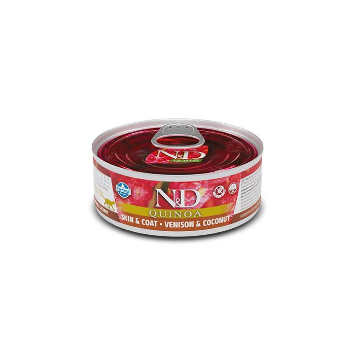N&D Quinoa Skin & Coat - Venison & Coconut è un alimento dietetico completo per gatti, consigliato per la riduzione di intolleranze a ingredienti e sostanze nutritive.