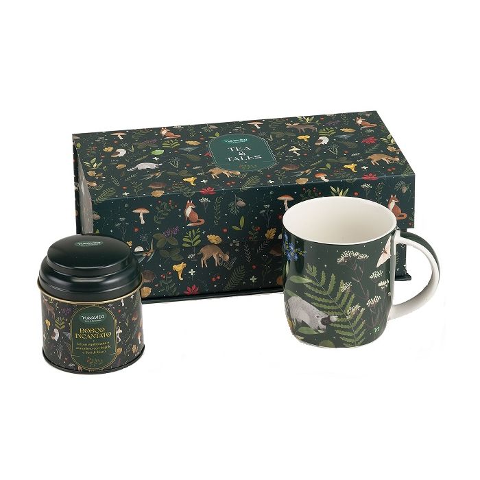 DescrizioneCofanetto con tazza in ceramica e barattolino con filtroscrigno Bosco Incantato.