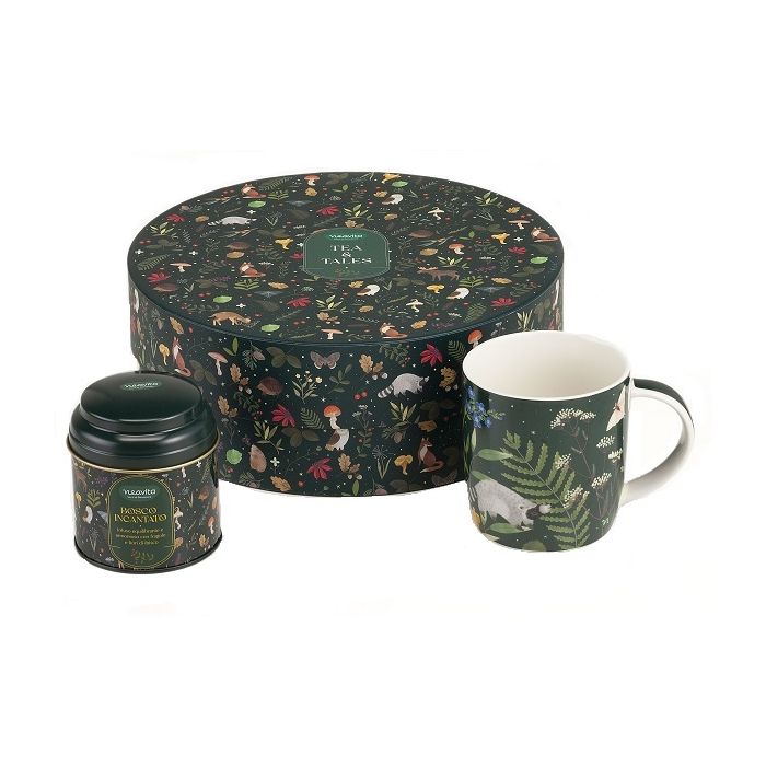 DescrizioneCofanetto con tazza in ceramica e barattolino con filtroscrigno Bosco Incantato.