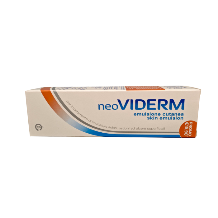 Neoviderm è un’emulsione cutanea caratterizzata da elevate proprietà idratanti ed emollienti, indicata come trattamento coadiuvante in caso di scottature e problemi cutanei legati all’esposizione a radiazioni, come quelle solari. È particolarmente utile in presenza di scottature solari, ustioni di I° grado e II° grado superficiali, ulcere superficiali, irritazioni cutanee e manifestazioni accompagnate da rossore, anche in seguito a radioterapia, peeling chimici o piccole abrasioni. Grazie alla sua azione protettiva e idratante, Neoviderm lenisce la pelle e dona sollievo immediato, favorendo il fisiologico processo di normalizzazione cutanea. L’applicazione regolare contribuisce a un’idratazione profonda, aiutando a ristabilire l’equilibrio osmotico-cellulare e sostenendo il naturale processo di riparazione dei tessuti. La texture è fresca, gradevolmente profumata, non unge e si stende facilmente. Non contiene filtri solari.
