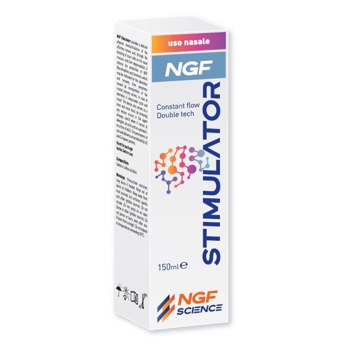 NGF Stimulator provvede a una delicata neuro-stimolazione fisica dei filamenti olfattivi e, attraverso il richiamo dei mastociti sulla mucosa nasale e alla loro degranulazione, all’induzione della produzione di neurotrofine NGF e Serotonina, che possono trovare indicazioni utili nell’attenuazione e recupero dei sintomi causati da neuropatie dei nervi sensoriali cranici e nei casi di alterazioni dei cicli sonno-veglia e dell’umore. Il dispositivo agisce anche come lavaggio del naso e dei seni paranasali eliminando l’eccesso di muco dalle vie aeree superiori, utile in caso di allergie, sinusiti e ad azione preventiva delle otiti. I parametri di uso e di erogazione sono protetti da brevetti Usa ed Europei.