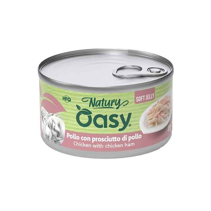 Oasy wet cat natury soft jelly pollo con prosciutto di pollo lattina 85 g