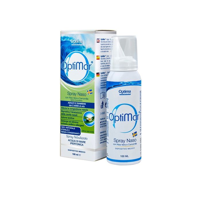 OptiMar Spray Naso con Aloe Vera e Camomilla, inoltre, idrata il naso irritato da raffreddore, allergia e inquinamento.