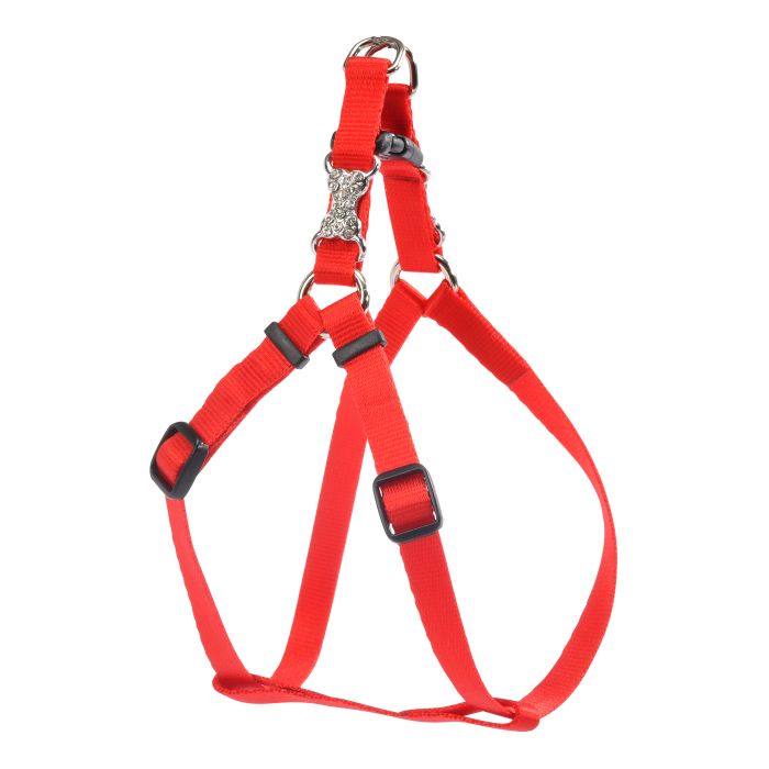 Pettorina in nylon, impreziosita da un elegante decoro in strass a forma di osso e abbinabile al rispettivo guinzaglio.