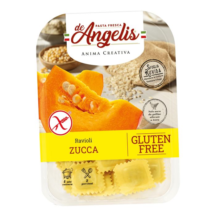 Pasta fresca all'uovo con ripieno di zucca, specificamente formulata per persone intolleranti al glutine.