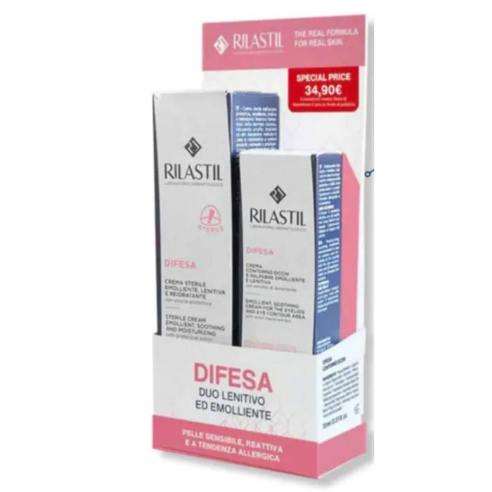 Rilastil Difesa Cofanetto combina la Crema Sterile Emolliente Lenitiva Reidratante 50 ml e il Contorno Occhi e Palpebre 15 ml, offrendo un trattamento completo per pelle sensibile, intollerante e reattiva. La Crema Sterile è indicata per pelli predisposte a manifestazioni allergiche o eczematose e garantisce un’azione protettiva, emolliente e reidratante, favorendo l’omeostasi della barriera cutanea e riducendo prurito e bruciore. Il Contorno Occhi, con formula essenziale, è specifico per l’area perioculare sensibile, aiutando a contrastare secchezza, arrossamenti e irritazioni. Entrambi i prodotti sono ipoallergenici, non comedogenici e privi di conservanti e profumo.