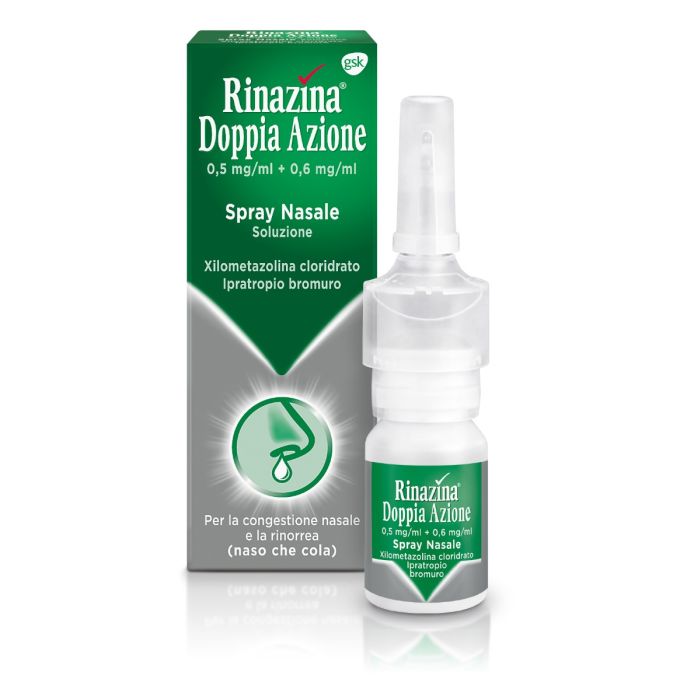 Rinazina Doppia Azione è uno spray nasale medicinale indicato per adulti, ideale per trattare congestione nasale e rinorrea (naso che cola), tipiche del comune raffreddore. La sua formula unisce due principi attivi:- Xilometazolina cloridrato: decongestionante che libera rapidamente le vie nasali