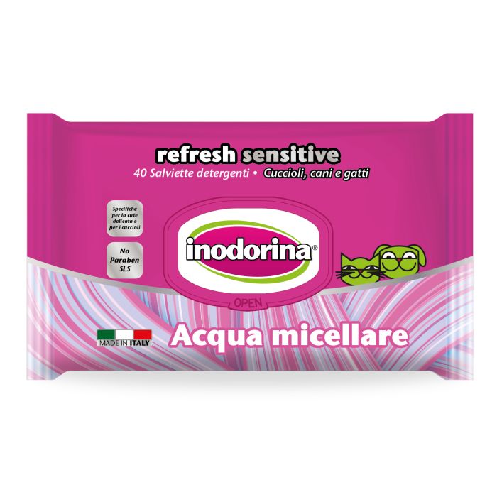 Le salviette Inodorina Refresh Sensitive hanno una formulazione adatta a cute delicata e soggetta ad allergie ed a cuccioli. Imbevute in una lozione leggera con Acqua Micellare, le salviette Refresh Sensitive permettono una efficace pulizia del manto, rendendolo lucido e profumato e mantenendo inalterato il pH naturale della pelle.