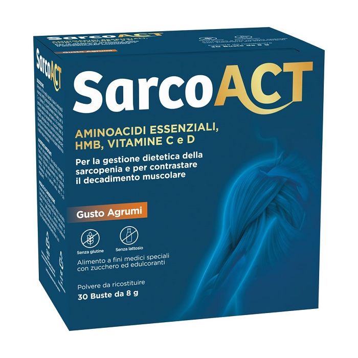 Alimento a fini medici speciali a base di aminoacidi essenziali, HMB (beta -idrossi-beta -metilbutirrato), vitamina C e vitamina D, scientificamente formulato per la gestione dietetica della sarcopenia o di condizioni caratterizzate da decadimento muscolare (stati di fragilità, patologie acute o croniche accompagnate da perdita di massa muscolare) per le quali SarcoAct può favorire il mantenimento e il recupero della forza e della massa muscolare.