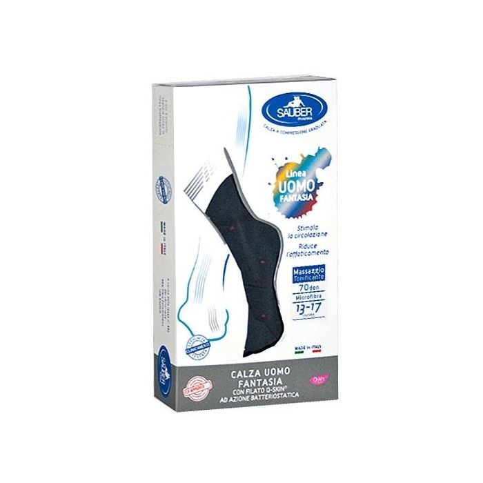 Calze uomo fantasia a compressione graduata in filato Q-SKIN, ad azione batteriostatica per facilitare la traspirazione della pelle e ridurre la sudorazione del piede. Possono essere abbinate sia ad un look classico ed elegante, sia ad un abbigliamento casual e giovanile. Ideali per essere indossate in qualunque occasione, dal lavoro al tempo libero, fino all’occasione speciale. Realizzate con polsino morbido che non stringe, e con punta e tallone in tinta unita.
