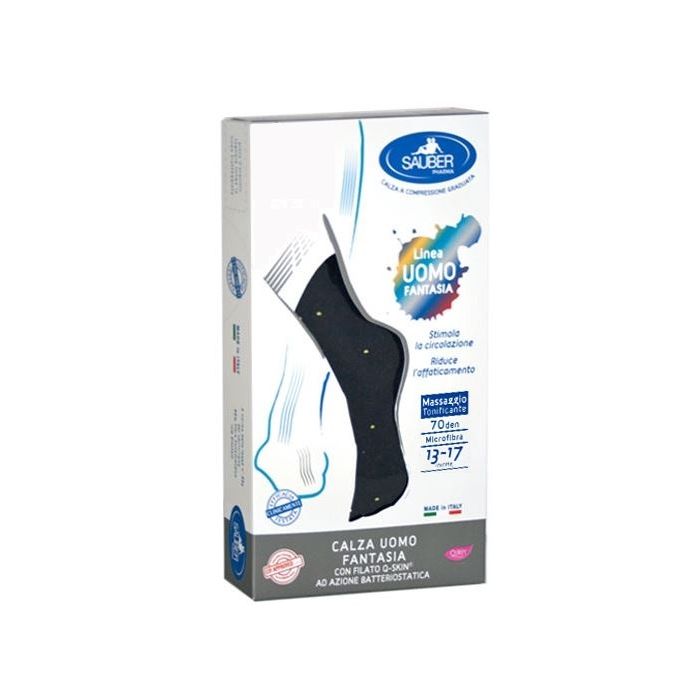 Calze uomo fantasia a compressione graduata in filato Q-SKIN, ad azione batteriostatica per facilitare la traspirazione della pelle e ridurre la sudorazione del piede. Possono essere abbinate sia ad un look classico ed elegante, sia ad un abbigliamento casual e giovanile. Ideali per essere indossate in qualunque occasione, dal lavoro al tempo libero, fino all’occasione speciale. Realizzate con polsino morbido che non stringe, e con punta e tallone in tinta unita.