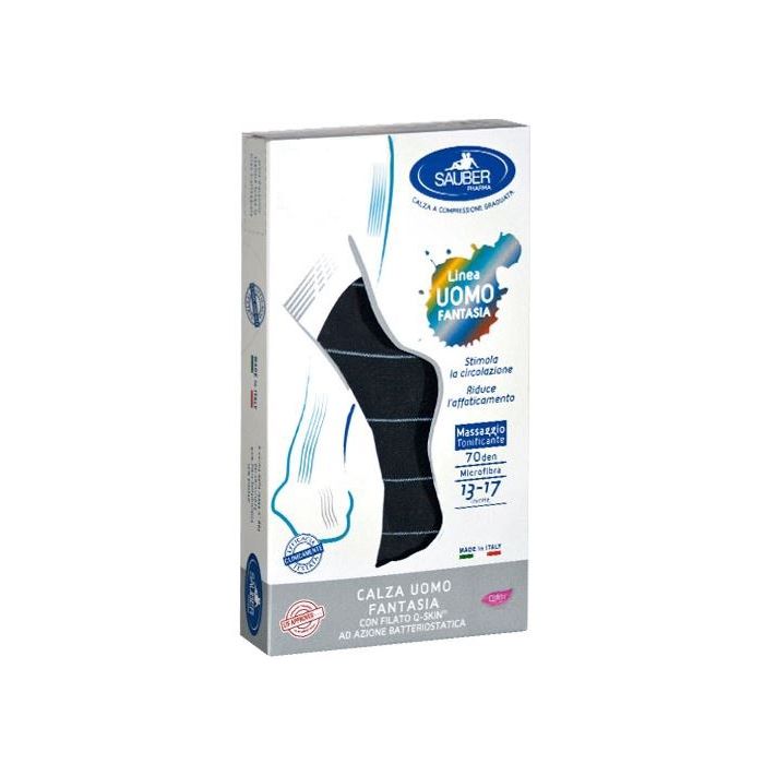 Calze uomo fantasia a compressione graduata in filato Q-SKIN, ad azione batteriostatica per facilitare la traspirazione della pelle e ridurre la sudorazione del piede. Possono essere abbinate sia ad un look classico ed elegante, sia ad un abbigliamento casual e giovanile. Ideali per essere indossate in qualunque occasione, dal lavoro al tempo libero, fino all’occasione speciale. Realizzate con polsino morbido che non stringe, e con punta e tallone in tinta unita.