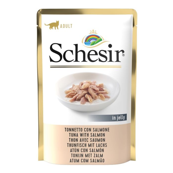 Una ricetta Schesir a base di veri filetti di delizioso tonnetto, abbinatti al salmone, ricco di omega 3. Ingredienti preparati in gelatina, per soddisfare il gusto dei gatti che prediligono il sapore del mare, ma con una consistenza più compatta nella ciotola.