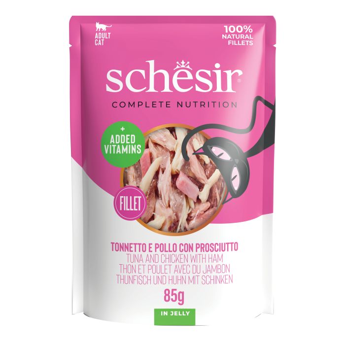 Una ricetta Schesir a base di tonnetto e pollo, arricchita da gustoso prosciutto. Ingredienti preparati in gelatina, per soddisfare il gusto dei gatti che prediligono il sapore del mare, ma con una consistenza più compatta nella ciotola.