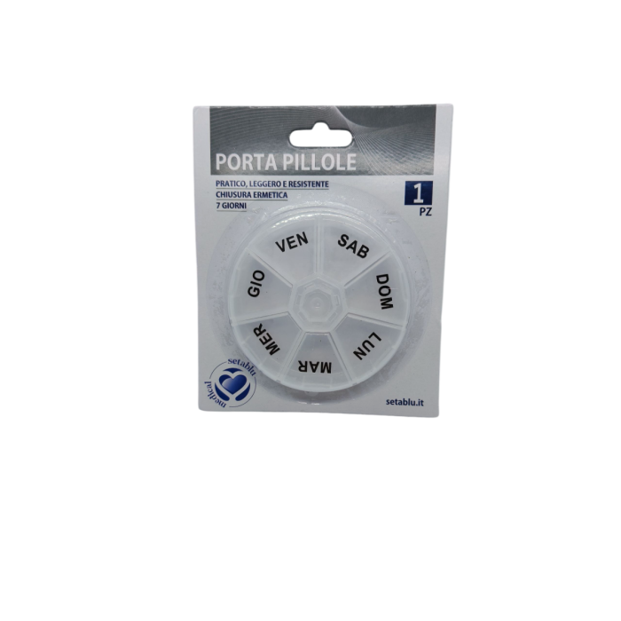 Setablu Portapillola Rotondo Premium è l’accessorio indispensabile per chi desidera tenere in ordine e sotto controllo l’assunzione giornaliera di farmaci o integratori. Il pratico design rotondo è suddiviso in scomparti separati, ciascuno dedicato a un giorno della settimana, per facilitare la gestione della terapia settimanale. Realizzato in materiale plastico resistente e sicuro, è compatto, leggero e ideale anche da portare in viaggio. Il coperchio a rotazione consente un facile accesso alle pillole evitando aperture accidentali. Soluzione elegante e funzionale per la routine quotidiana.