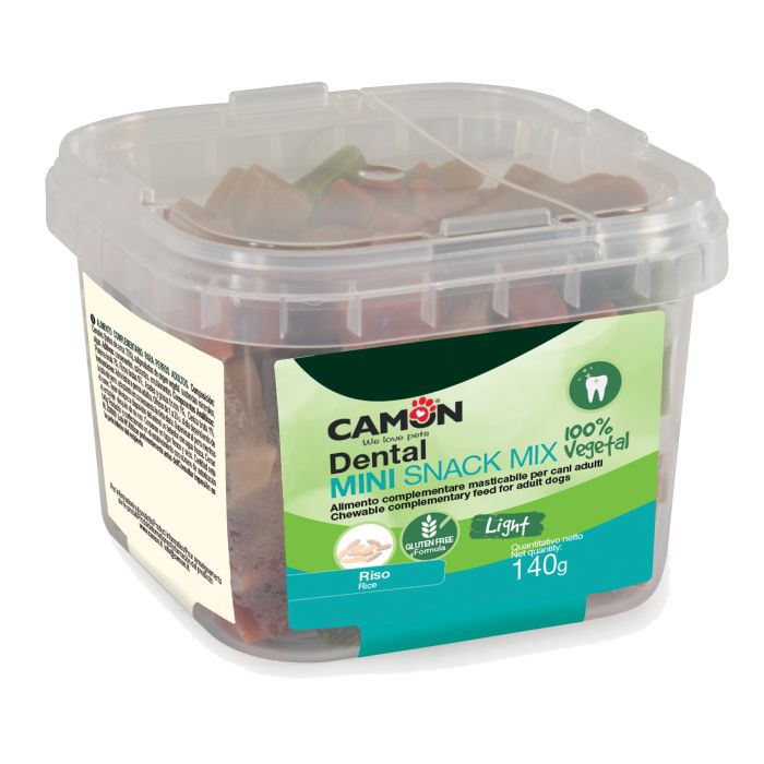 Sfiziosi snack 100% vegetali con riso, a forma di piccoli denti colorati. Ideali come spuntino ricompensa a completamento della dieta abituale del cane. Formula gluten free.