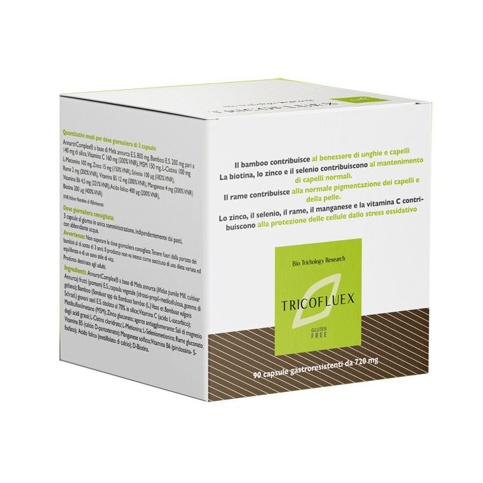 AnnurtriComplex mela annurca (Malus pumila Mill. cultivar Annurca) frutti (pomum) e.s. tit. in procianidina B2 0,02%, capsula vegetale (idrossi-propil-metilcellulosa, gomma di gellano), bamboo [Bambusa spp da Bambusa bambos (L.) Voss et Bambusa vulgaris Schrad.] giovani steli e.s. tit. al 70% in silice, vitamina C (acido L-ascorbico), metilsulfonilmetano (MSM), zinco gluconato; agente antiagglomerante: sali di magnesio degli acidi grassi; L-cistina cloridrato, L-metionina, L-seleniometionina, rame gluconato, vitamina B5 (calcio D-pantotenato), manganese solfato, vitamina B6 (piridossina-5-fosfato), acido folico (metilfolato di calcio), biotina.